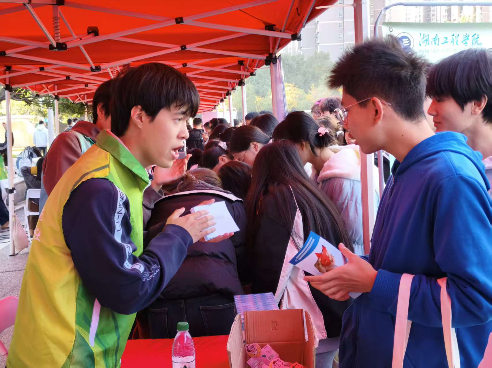 活动现场,志愿者们迅速投入场地布置工作,搭建宣传展台、整理宣传资料与互动奖品。宣传展台设置了包含艾滋病传播途径、预防措施等内容的科普易拉宝,并准备了知识问答和趣味游戏环节。通过寓教于乐的方式向在场大学生普及艾滋病防治知识,志愿者们耐心引导参与者完成各环节任务,现场气氛活跃,在轻松互动中有效传播了防艾知识,增强了青年学子对艾滋病的科学认知和防护意识。